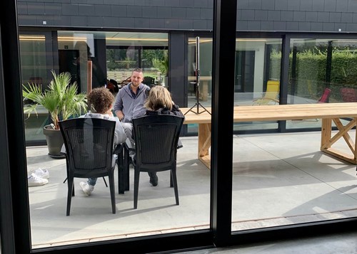 Interview sur la terrasse avec la piscine bleu azur en toile de fond.